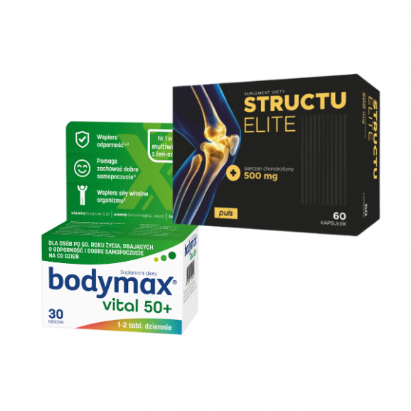 Komplet łączy Bodymax Vital 50+ – suplement diety dla osób po 50. roku życia, wspierający witalność, koncentrację i odporność – z PULS Structu Elite, preparatem zawierającym glukozaminę, chondroitynę i dodatkowe składniki wspierające zdrowie i elastyczność stawów.