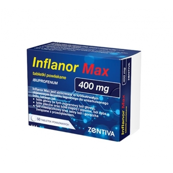 Inflanor Max 400 mg to niesteroidowy lek przeciwzapalny (NLPZ) wykazujący działanie przeciwbólowe, przeciwzapalne i przeciwgorączkowe.