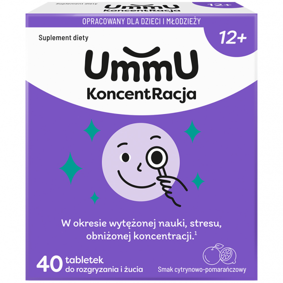 - Nazwa produktu: UmmU Koncentracja tabletki do żucia CYTRYNA-POMARAŃCZA 12+ – suplement diety