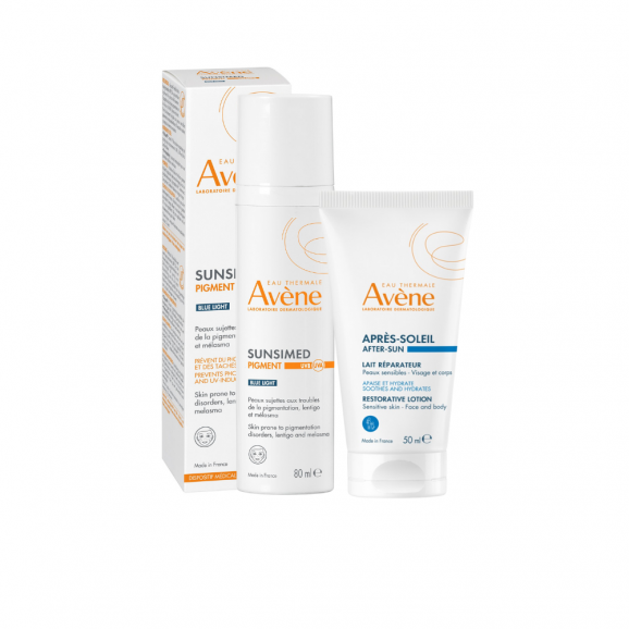 Zestaw Avene Sunsimed Pigment Blue Light SPF 50+ i Avene Apres Soleil After Sun to idealne połączenie dla skóry wymagającej kompleksowej pielęgnacji. Krem Sunsimed Pigment chroni skórę nie tylko przed promieniowaniem UVA i UVB, ale także przed światłem niebieskim (Blue Light), które może nasilać przebarwienia i przyspieszać starzenie skóry.