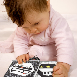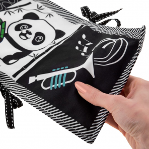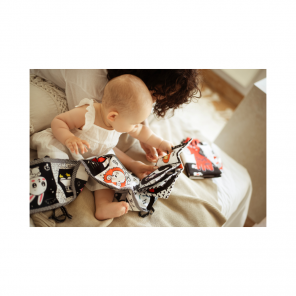 Miękka, szeleści przy dotyku, oraz posiada 12 różnych kontrastowych obrazków, dzięki czemu pobudza zmysły i ciekawość maluszka.