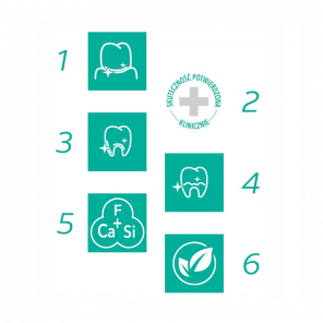 Sodium Fluoride (fluorek sodu) - składnik aktywny zapobiegający powstawaniu ubytków.