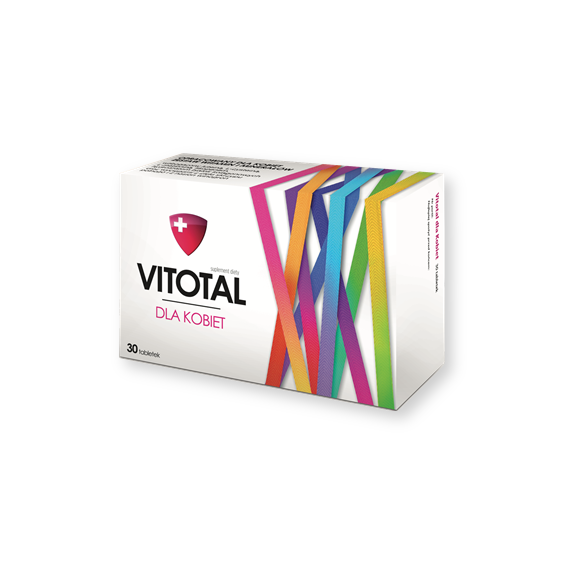 Vitotal dla Kobiet - suplement diety zawierający w swoim składzie zestaw witamin i minerałów dodatkowo wzbogacony luteiną, L-cysteiną, L-metioniną, likopenem, hydrolizatem białek kolagenowych oraz wyciągami z ziela skrzypu polnego i z nasion winogron.