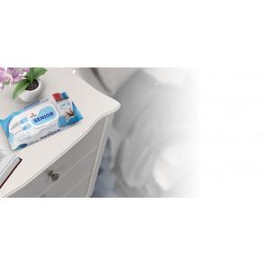 Wyjątkowa formuła chusteczek, wzbogacona witaminą E, allantoiną i gliceryną, chroni i regeneruje skórę, zapewniając jej odpowiednie nawilżenie. Produkt jest przyjazny dla wrażliwej skóry i nie wymaga użycia wody czy mydła.
