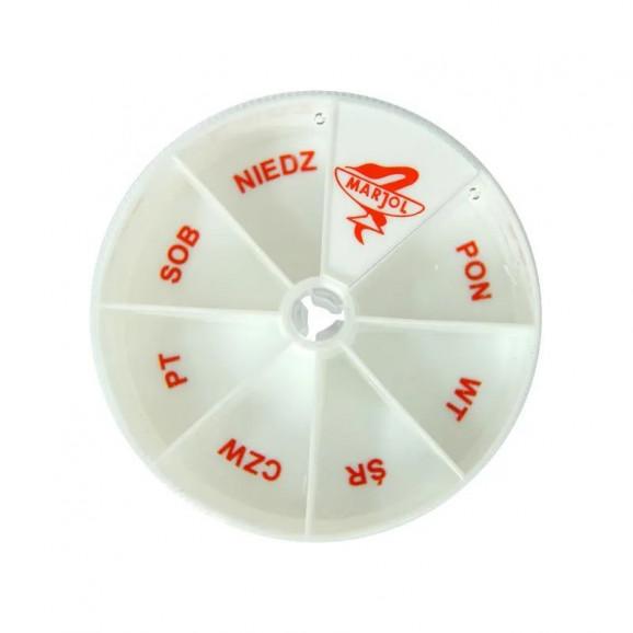 Praktyczna, okrągła kasetka umożliwiającą dawkowanie leków przez cały tydzień.