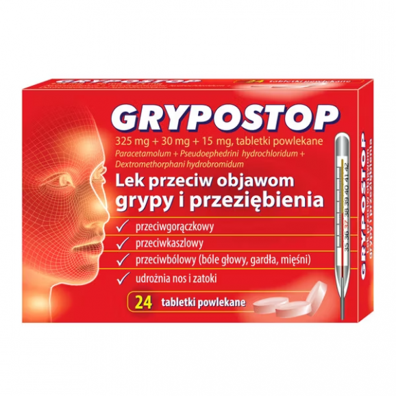 Grypostop to preparat do doraźnego leczenia objawów przeziębienia, grypy i stanów grypopodobnych, objawiających się gorączką, kaszlem, bólem głowy, płynnymi pokreślonymi membranami, bólami mięśniowymi i kostno-stawowymi. Każda tabletka zawiera aktywne składniki takie jak paracetamol, pseudoefedryna i dekstrometorfan.