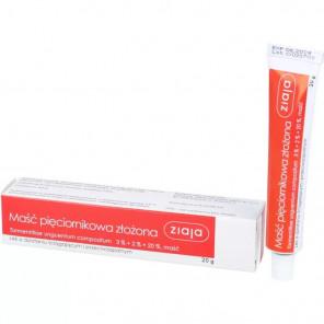 Maść pięciornikowa złożona jest lekiem przygotowanym zgodnie z monografią Farmakopei Polskiej, zawierającym substancje czynne takie jak wyciąg płynny z kłącza pięciornika, sulfobituminian amonowy i tlenek cynku. Stosowana zewnętrznie na skórę pełni funkcję ściągającą, wysuszającą oraz odkażającą. Przeznaczona do stosowania na niewielkie uszkodzenia skóry, takie jak otarcia naskórka i zadrapania.