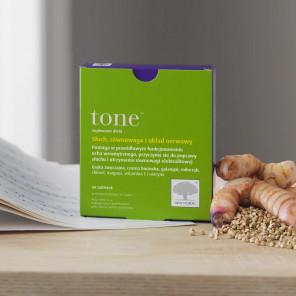 Tone to suplement diety dedykowany osobom dbającym o utrzymanie dobrego słuchu. Zawiera mieszankę ziołową wraz z magnezem, niacyną i witaminą C, które wspierają prawidłowe funkcjonowanie ucha wewnętrznego, redukcję zmęczenia oraz przyczyniają się do ochrony przed stresem oksydacyjnym. Produkt skomponowany we współpracy z New Nordic Healthbrands AB.