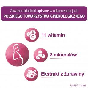 1 tabl. zawiera: foliany (200% RWS); witaminę C (150% RWS); żelazo (143% RWS); witaminę B6 (136% RWS); jod (133% RWS); tiaminę (127% RWS); ryboflawinę (114% RWS); niacynę, witaminy E, D, kwas pantotenowy, cynk, miedź, selen i molibden w ilościach pokrywających 100% RWS; mangan (75% RWS); witaminę A (63% RWS); wapń (30% RWS) oraz 40 mg ekstraktu z owoców żurawiny.