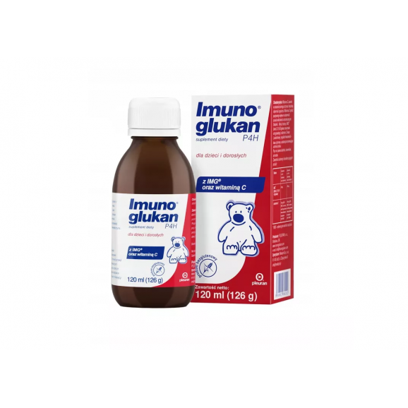 Imunoglukan P4H to wysokiej jakości suplement diety zawierający biologicznie aktywny polisacharyd Imunoglukan oraz witaminę C. Produkt wspiera naturalną odporność organizmu, wspomaga powrót do zdrowia po antybiotykoterapii, radioterapii lub chemoterapii oraz działa korzystnie w okresie zmęczenia i stresu. Zalecany dla osób z powtarzającymi się infekcjami oraz dla sportowców. Syrop ma formę przyjazną dla żołądka i jest bezglutenowy.