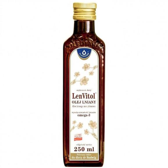 LenVitol (Oleofarm) to olej lniany budwigowy tłoczony na zimno, wytwarzany z wysokolinolenowych odmian ziaren lnu. Charakteryzuje się bardzo wysoką zawartością wielonienasyconych kwasów tłuszczowych – w szczególności omega‑3 (kwasu alfa‑linolenowego, ALA). W diecie warto zastępować tłuszcze nasycone tłuszczami nienasyconymi – pomaga to w utrzymaniu prawidłowego poziomu cholesterolu we krwi.