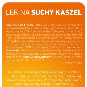 DEXAPico to syrop leczniczy zawierający dekstrometorfanu bromowodorek oraz wyciąg wodny z kwiatostanu lipy, szczególnie skuteczny w łagodzeniu suchego, męczącego kaszlu. Działa poprzez hamowanie ośrodka kaszlu w ośrodkowym układzie nerwowym oraz łagodzi podrażnienia za pomocą naturalnego wyciągu z lipy. Zaleca się stosować ostrożnie, przestrzegając zalecanej dawki. Nie stosować u dzieci poniżej 2 lat.
