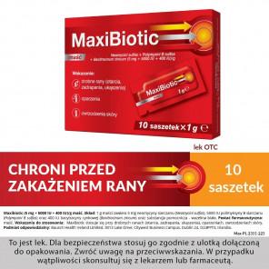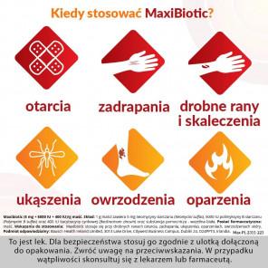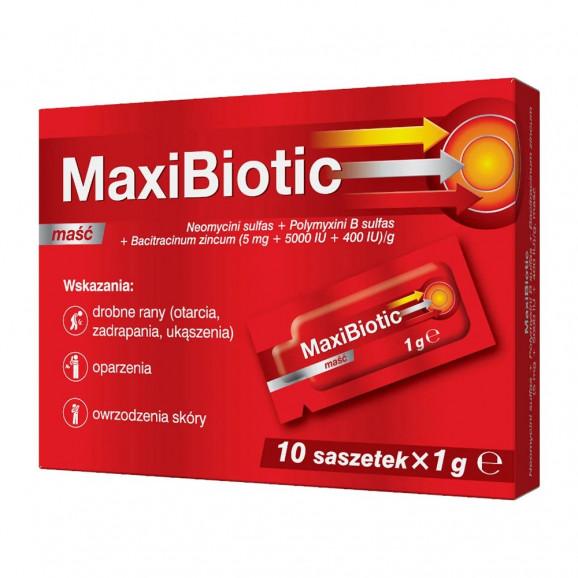 Maxibiotic jest maścią zawierającą trzy antybiotyki o uzupełniającym działaniu przeciwbakteryjnym: neomycynę, polimyksynę B oraz bacytracynę cynkową. Przeznaczona do leczenia niewielkich ran, takich jak otarcia, zadrapania, ukąszenia, oparzenia czy owrzodzenia. Maść aplikowana miejscowo działa ochronnie i wspiera szybkie gojenie oraz nawilża okolice uszkodzonego naskórka.