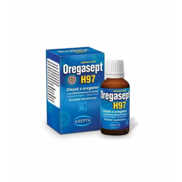 Oregasept H97 (olejek z oregano) to suplement diety w formie kropli. Zawiera naturalną oliwę z oliwek extra virgin oraz olejek z oregano (Origanum vulgare) standaryzowany na zawartość karwakrolu. Produkt jest przeznaczony do stosowania doustnego po rozcieńczeniu w płynie (np. w wodzie, soku lub herbacie). Dobre rezultaty daje także rozcieńczenie w maślance, jogurcie lub kefirze.