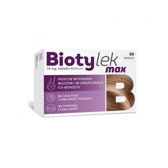 Biotylek Max to produkt leczniczy zawierający biotynę. Wspomaga produkcję keratyny, poprawiając kondycję skóry, włosów i paznokci. Stosowany w celu leczenia niedoborów witaminy H u dorosłych, objawiających się wypadaniem włosów, łamliwością paznokci oraz stanami zapalnymi skóry. Tabletki mogą być stosowane po uzyskaniu zgody lekarza w przypadku dzieci i młodzieży. Produkt można podzielić na mniejsze dawki w razie potrzeby. Zauważa się poprawę po około 4 tygodniach terapii.