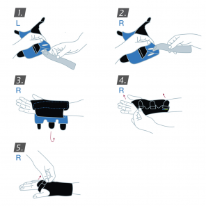 - Wsunąć rękę do ortezy, dopasować regulatory pasków, aby uzyskać wygodne przyleganie.