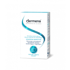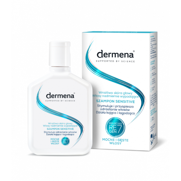 Dermena Sensitive to dermatologicznie przebadany szampon przeznaczony do wrażliwej skóry głowy ze skłonnością do podrażnień oraz do nadmiernie wypadających włosów. Składniki aktywne, takie jak molekuła Regen 7, łagodzą skórę głowy i wspierają wzrost nowych włosów oraz ograniczają ich wypadanie. Szampon wzmacnia włosy już od cebulek i przywraca im gęstość oraz objętość.
