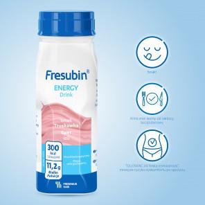 Fresubin Energy Drink o smaku truskawkowym to bogata w składniki odżywcze dieta wysokoenergetyczna, zawierająca 1,5 kcal/ml. Każda butelka dostarcza 300 kcal oraz 11,2 g białka, odpowiadając na zapotrzebowanie energetyczne osób dorosłych. Nie zawiera laktozy, glutenu ani syropu glukozowego, jest także klinicznie wolny od związków purynowych i błonnika – stanowiąc dietę bezresztkową. Szczególnie zalecany dla osób podczas przygotowania do operacji.