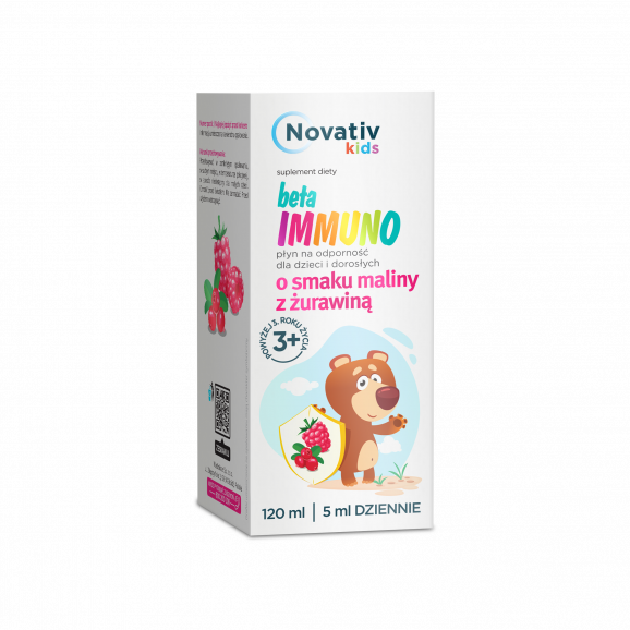 Novativ Kids Beta Immuno to suplement diety w formie płynnej, dedykowany dzieciom powyżej 3 lat oraz dorosłym. Posiada przyjemny smak maliny z żurawiną. Formuła produktu zawiera składniki wspierające naturalne mechanizmy obronne organizmu - beta-glukany z drożdży, witaminy C, D, B12 oraz L-argininę i cynk, będące nieodzowne dla wsparcia prawidłowego funkcjonowania układu odpornościowego. Produkt znajduje szczególne zastosowanie w okresach zwiększonego ryzyka przeziębienia czy grypy.