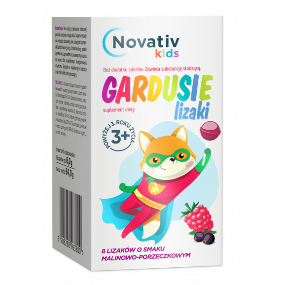 - Nazwa produktu: Novativ Kids Gardusie – lizaki o smaku malinowo-porzeczkowym