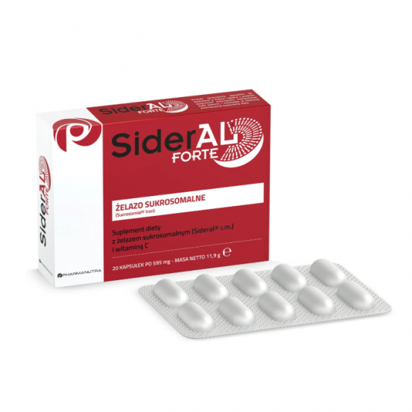 SiderAL Forte zawiera żelazo sukrosomalne w postaci kapsułek, które jest wchłaniane w jelicie, umożliwiając minimalizowanie działań niepożądanych na układ pokarmowy. Witamina C zwiększa wchłanianie żelaza i chroni komórki przed stresem oksydacyjnym. Produkt pomaga w produkcji hemoglobiny, transportuje tlen, redukuje zmęczenie i wspomaga prawidłowe funkcje układu odpornościowego.
