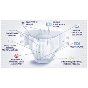 Produkt składa się z oddychającego laminatu, anatomicznego wkładu chłonącego z superabsorbentem neutralizującym zapach, elastycznych przylepców oraz falbanek bocznych.