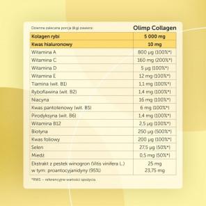 - kolagen rybi ECOllagen® 5000 mg, kwas hialuronowy 10 mg, witamina C 160 mg (200%)*, witamina A 800 µg (100%)*, witamina E 12 mg (100%)*, witamina D 5 µg (100%)*, tiamina 1,1 mg (100%)*, ryboflawina 1,4 mg (100%)*, niacyna 16 mg (100%)*, kwas pantotenowy 5 mg (100%)*, witamina B6 1,4 mg (100%)*, biotyna 250 µg (500%)*, kwas foliowy 200 µg (100%)*, witamina B12 2,5 µg (100%)*, selen 27,5 µg (50%)*, miedź 0,5 mg (50%)*, ekstrakt z pestek winogron 25 mg, w tym proantocyjanidyny 23,75 mg.