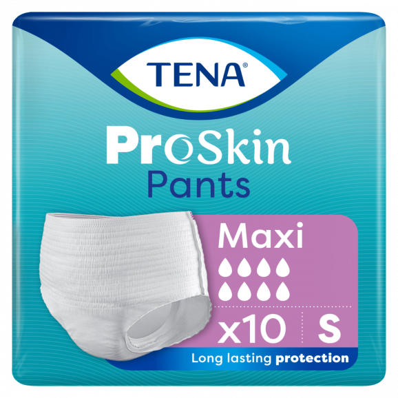 TENA Pants ProSkin Maxi S to innowacyjne majtki chłonne dla osób zmagających się z nietrzymaniem moczu, oferujące najwyższą jakość ochrony dzięki technologii FeelDry Advanced™. Produkt przeznaczony zarówno dla kobiet, jak i mężczyzn, zapewnia dyskrecję, komfort oraz ochronę skóry. Przebadane dermatologicznie i akredytowane przez Skin Health Alliance.
