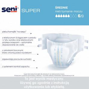 Seni Super to pieluchomajtki dla dorosłych zapewniające wysokie poczucie suchości i komfortu. Posiadają system Extra Dry System, który skutecznie rozprowadza wilgoć, oraz hydrofobowe osłonki boczne zapobiegające przeciekaniu. Są oddychające, co zmniejsza ryzyko odparzeń i podrażnień. Bez lateksu, testowane dermatologicznie, zalecane dla aktywnych oraz osób leżących.
