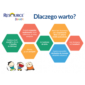 Resource Junior to pełnowartościowy, wysokoenergetyczny napój odżywczy przeznaczony dla dzieci powyżej 1 roku życia, który pomaga w zapewnieniu odpowiednich składników odżywczych niezbędnych do wzrostu i rozwoju. Produkt stosuje się w diecie dzieci, które zmagają się z niedożywieniem z różnych powodów, w tym przewlekłych chorób, jadłowstrętu czy problemów z gryzieniem i połykaniem. Formuła wzbogacona o zestaw 28 witamin i składników mineralnych wspiera odporność i rozwój.