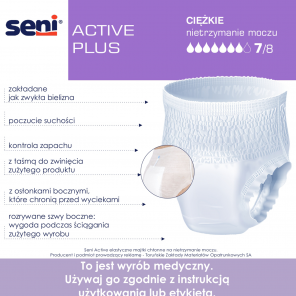 Seni Active Plus to jednorazowe, elastyczne majtki chłonne o wysokiej chłonności, idealne dla osób ze średnim i ciężkim nietrzymaniu moczu oraz aktywnie uczestniczących w rehabilitacji ruchowej. Ich elastyczny krój dopasowuje się do ciała, zapewniając wygodę oraz ochronę przed przeciekaniem. Dzięki mechanicznemu rozrywaniu bocznych szwów, zużycie i ich utylizacja są łatwe i dyskretne. Wbudowany wskaźnik wilgoci wskazuje na potrzebę zmiany produktu. Włóknina zastosowana w produkcie umożliwia swobodne oddychanie skóry, redukując ryzyko podrażnień oraz zapobieganie odleżynom.