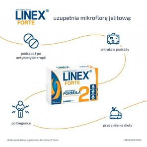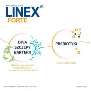 Linex Forte to suplement diety przeznaczony dla dzieci powyżej 3 roku życia oraz dorosłych, stworzony w celu wsparcia odbudowy florą bakteryjną jelit w trakcie terapii antybiotykowej i w okresie rekonwalescencji. Produkt zawiera szczepy Lactobacillus acidophilus LA-5® i Bifidobacterium animalis subsp. lactis BB-12®, które wspomagają prawidłowe funkcjonowanie przewodu pokarmowego. Składniki takie jak inulina i oligofruktoza działają jako prebiotyki, wspierając rozwój pożytecznych bakterii jelitowych.