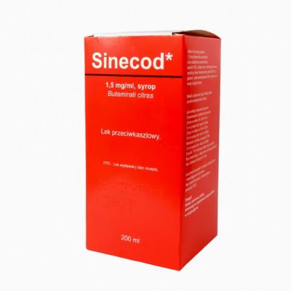 Sinecod to lek w formie syropu przeciwkaszlowego, zawierający cytrynian butamiratu. Jest nierefundowany i dostępny bez recepty. Skutecznie łagodzi kaszel poprzez hamowanie ośrodkowego mechanizmu kaszlu. Zawiera sorbitol i niewielkie ilości etanolu oraz sacharynę sodową. Odpowiedni dla dorosłych i dzieci od 3 lat. Stosować zgodnie z dawkowaniem: dzieci 3-6 lat: 5 ml trzy razy dziennie, dzieci 6-12 lat: 10 ml trzy razy dziennie, młodzież powyżej 12 lat i dorośli: 15 ml od trzech do czterech razy dziennie. Dostępny w opakowaniu z miarką umożliwiającą dokładne odmierzenie dawki.