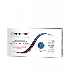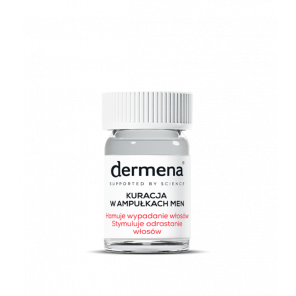Kuracja ampułkowa dermena® Men jest specjalistycznym produktem do hamowania wypadania włosów i wspomagania ich odrastania u mężczyzn. Produkt zawiera molekułę REGEN7 oraz multikompleks H-VIT, które pobudzają wzrost nowych włosów, jednocześnie redukując łojotok i podrażnienia skóry głowy. Rekomendowane do stosowania przez minimum 3 miesiące dla widocznych rezultatów – 83% mężczyzn zgłasza redukcję wypadania włosów, a 90% odnotowuje poprawę ogólnej kondycji skóry głowy.