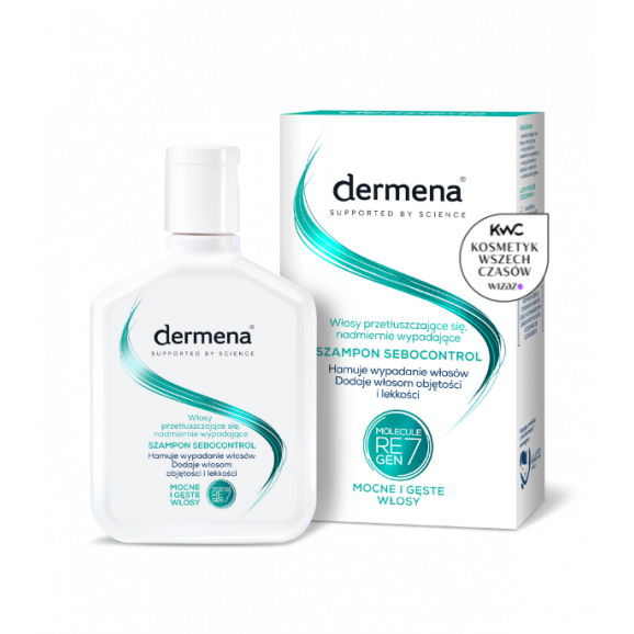 Dermena Sebocontrol to szampon stworzony z myślą o kompleksowej pielęgnacji przetłuszczających się włosów oraz skóry głowy. Wzbogacony o Molekułę Regen7, ekstrakt ze skrzypu polnego i Octopirox, które działają wzmacniająco, regulują wydzielanie łoju, jak i ograniczają wypadanie włosów, wspierając ich wzrost. Dzięki konsystencji szamponu wspiera regulowanie pracy gruczołów łojowych oraz utrzymanie fizjologicznego pH skóry głowy. Regularne stosowanie przyczynia się do zmniejszenia przetłuszczania włosów, zwiększenia objętości oraz pojawienia się tzw. 'baby hair'. Formuła jest odpowiednia dla wrażliwej skóry głowy i może być stosowana już od 5. roku życia.