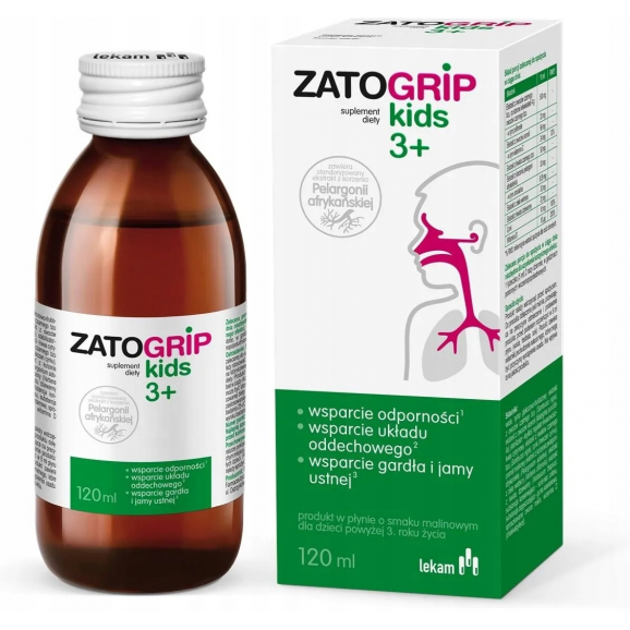 Zatogrip kids 3+ to suplement diety dedykowany dla dzieci powyżej 3. roku życia. Jest to produkt w płynie o smaku malinowym, którego składniki aktywnie wspierają odporność, układ oddechowy, a także zdrowie gardła i jamy ustnej.