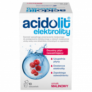 Acidolit to środek żywieniowy szczególnego przeznaczenia stosowany głównie w stanach zwiększonej utraty wody oraz składników mineralnych, takich jak podczas biegunki czy wymiotów. Jest odpowiedni dla niemowląt, dzieci, a także dorosłych. Produkt zawiera proszek w saszetkach, który po zmieszaniu z wodą tworzy doustny płyn nawadniający zgodnie z zaleceniami ESPGHAN. Polecamy szczególnie w okresach odwodnienia organizmu, niwelując negatywne skutki biegunki i wymiotów. Zawiera naturalny smak malin, idealny także dla dzieci.