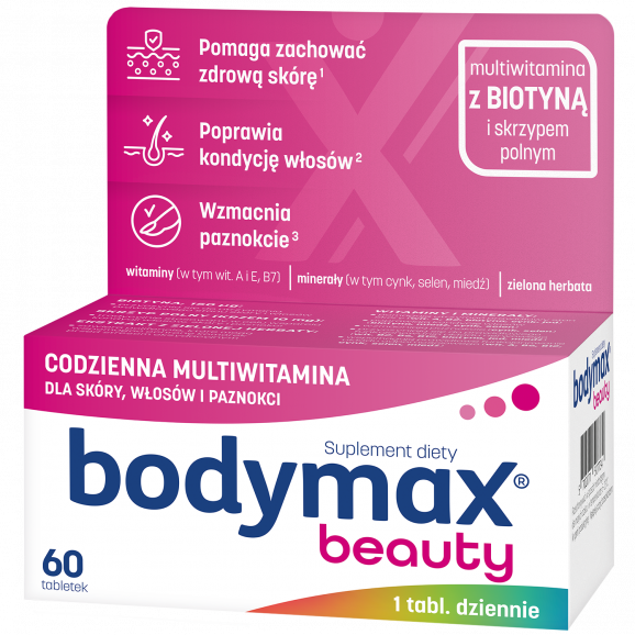 Bodymax Beauty to wyjątkowy suplement diety, który dostarcza organizmowi zestaw kluczowych witamin i minerałów wspomagających piękny wygląd skóry, lśniące włosy oraz mocne paznokcie. Wzbogacony o substancje aktywne jak skrzyp polny oraz wyciąg z zielonej herbaty, wspiera również odporność oraz pracę układu nerwowego.