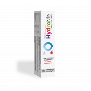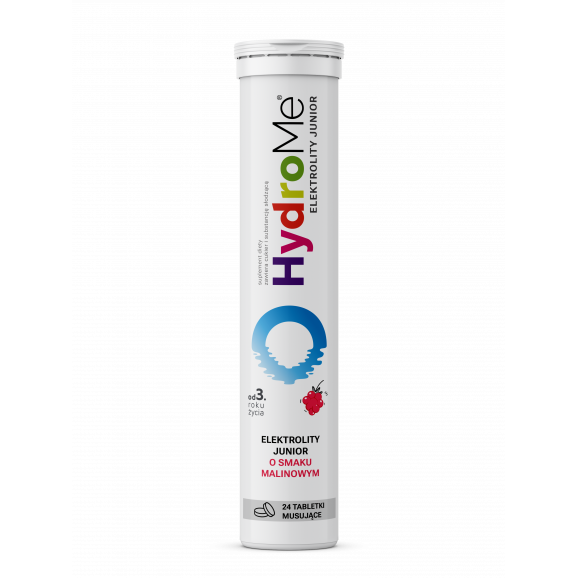 HydroMe Elektrolity Junior to suplement diety w postaci musujących tabletek o malinowym smaku, który pomaga utrzymać odpowiednie nawodnienie organizmu oraz wspiera funkcjonowanie układu nerwowego dzięki zawartości potasu, magnezu i witamin z grupy B. Produkt jest szczególnie przydatny w stanach zwiększonego wysiłku fizycznego, podczas upałów oraz w sytuacjach zwiększonej utraty płynów. Każda tabletka jest łatwa do rozpuszczenia w 200 ml wody, tworząc smaczny, orzeźwiający napój.