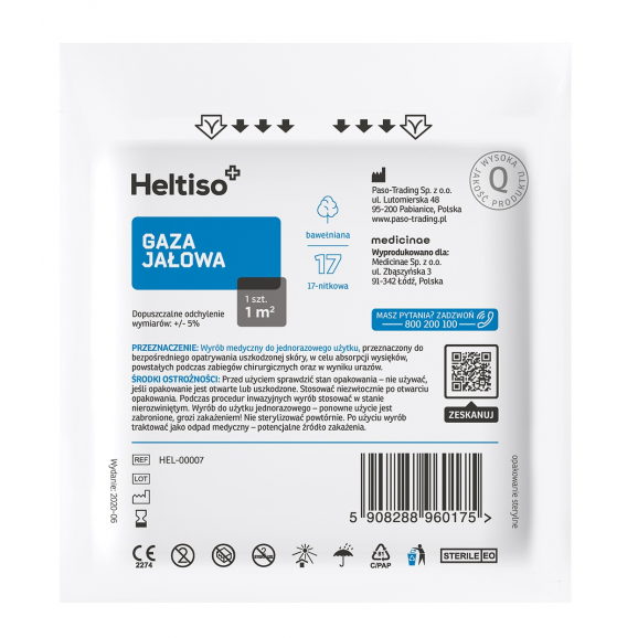 Gaza Heltiso to wyrób medyczny wykonany w 100% z bawełny o gęstości 17-nitkowej. Produkt przeznaczony jest do jednorazowego użytku jako bariera mechaniczna. Niejałowa, co oznacza, że przed użyciem na uszkodzonej skórze wymaga wcześniejszej sterylizacji. Doskonała do opatrywania wykorzystywanego np. w trakcie zabiegów chirurgicznych. Posiada oznakowanie CE oraz deklarację zgodności z przepisami UE.