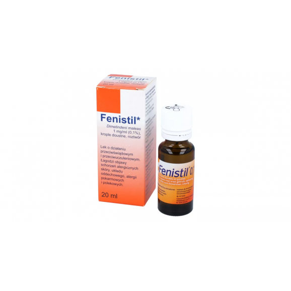 Fenistil w postaci kropli doustnych zawierający dimetyndenu maleinian to lek przeciwhistaminowy stosowany w łagodzeniu objawów chorób alergicznych. Działa poprzez hamowanie aktywności histaminy, co skutkuje zmniejszeniem świądu, podrażnienia oraz obrzęku. Lek jest również wskazany do łagodzenia objawów alergicznego zapalenia błon śluzowych nosa (katar sienny, przewlekłe alergie). Dawkowanie dla dorosłych i dzieci powyżej 12 lat wynosi od 20 do 40 kropli 3 razy dziennie.