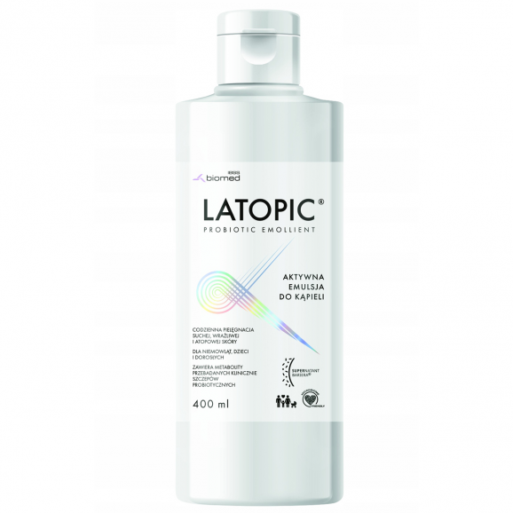 Latopic Emulsja do kąpieli to kosmetyk przeznaczony do pielęgnacji skóry atopowej, suchej oraz skłonnej do podrażnień. Dzięki zawartości metabolitów Lactobacillus sp., emulsja działa przeciwdrobnoustrojowo, pomagając zapobiegać rozwojowi Staphylococcus aureus. Produkt nie zawiera substancji zapachowych, sztucznych barwników i wykazuje właściwości hipoalergiczne, co czyni go bezpiecznym również dla niemowląt od 1. dnia życia. Szczególnie rekomendowany do codziennej pielęgnacji skóry niemowląt, dzieci i osób dorosłych.