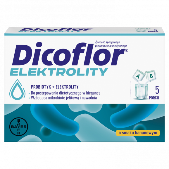 Dicoflor Elektrolity to preparat zalecany do stosowania podczas biegunki i wymiotów, wspomagający nawadnianie organizmu poprzez uzupełnienie braków elektrolitów i glukozy oraz wspierający mikroflorę jelitową dzięki obecności bakterii Lactobacillus rhamnosus GG. Produkt jest komfortowy w użyciu ze względu na brak konieczności przechowywania w lodówce, idealny w podróży oraz w czasie potrzeby szybkiego nawodnienia. Dedykowany jest zarówno dzieciom powyżej 1 roku życia, jak i dorosłym.