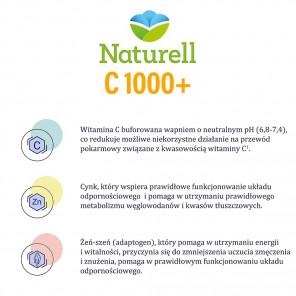 Naturell C 1000+ to suplement diety zawierający witaminę C, cynk i ekstrakt z korzenia żeń-szenia. Produkt wspiera układ odpornościowy i pomaga obniżyć zmęczenie, a zawarte składniki mają działanie antyoksydacyjne. Formuła zawiera BioPerine®, który zwiększa biodostępność składników. Preparat bez glutenu, laktozy, cukru i z syntezy, odpowiedni dla wegan i wegetarian.