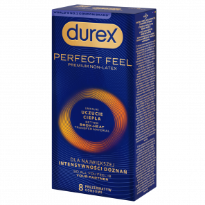 Durex Perfect Feel to delikatne prezerwatywy wykonane z innowacyjnego materiału nitrylowego Body Feel™, który przewodzi ciepło lepiej niż naturalny lateks. Prezerwatywy te zapewniają unikalne odczucia ciepła ciała partnerki/partnera, są ultracienkie z prostym kształtem zakończonym zbiorniczkiem, poprawiają komfort użytkowania dzięki zwiększonej ilości silikonowego lubrykantu. Są idealne dla osób z alergią na białka lateksu naturalnego.