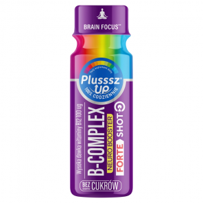 Plusssz® Up B-Complex Neuro Booster Forte shot to suplement diety w płynnej postaci, który zawiera kompleks witamin z grupy B w celu wspierania układu nerwowego. Posiada malinowy smak, jest pasteryzowany i nie zawiera dodatkowych cukrów. Witaminy B6 i B12 wspomagają układ nerwowy, tiamina wspiera funkcje psychologiczne, ryboflawina i niacyna przyczyniają się do metabolizmu energetycznego, a kwas pantotenowy wspomaga kondycję umysłową.
