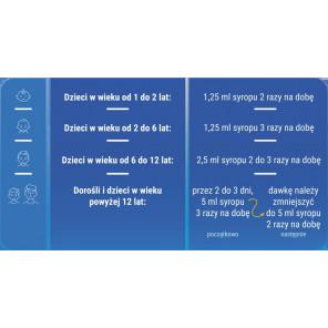 - Dorośli i dzieci powyżej 12 lat: 5 ml syropu 3 razy dziennie przez pierwsze dni, dalej 2 razy dziennie.
