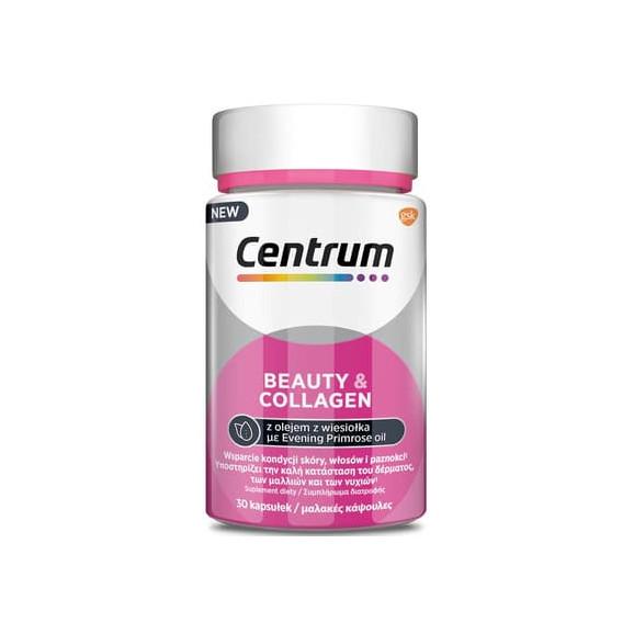 Centrum Beauty & Collagen to suplement diety w postaci kapsułek zawierających kolagen, zestaw witamin i minerałów oraz olej z wiesiołka. Preparat może stanowić uzupełnienie codziennej diety osób dorosłych.