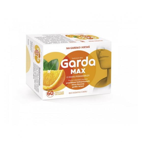 Garda Max to suplement diety w postaci pomarańczowych pastylek do ssania. Produkt wspiera nawilżenie gardła dzięki zawartości ekstraktu z porostu islandzkiego. Stanowi skuteczną pomoc przy suchości gardła oraz chrypce, oferując przyjemne doświadczenie smakowe dzięki olejkowi pomarańczowemu i cytrynowemu sycylijskiemu.