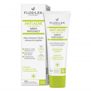 Krem matujący do twarzy Flos-lek Anti Acne 24h System to kosmetyk odpowiedni do pielęgnacji skóry mieszanej i tłustej, ze skłonnością do trądziku. Może być stosowany codziennie. Jest przyjazny dla wegan.